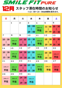 スマイルフィットピュアは基本的に無人での営業となっております。 ですが、入会していただいた皆様に、ご挨拶や施設の説明をさせてもらえたら思い、12月と1月はスタッフタイムを設定させていただきます‼