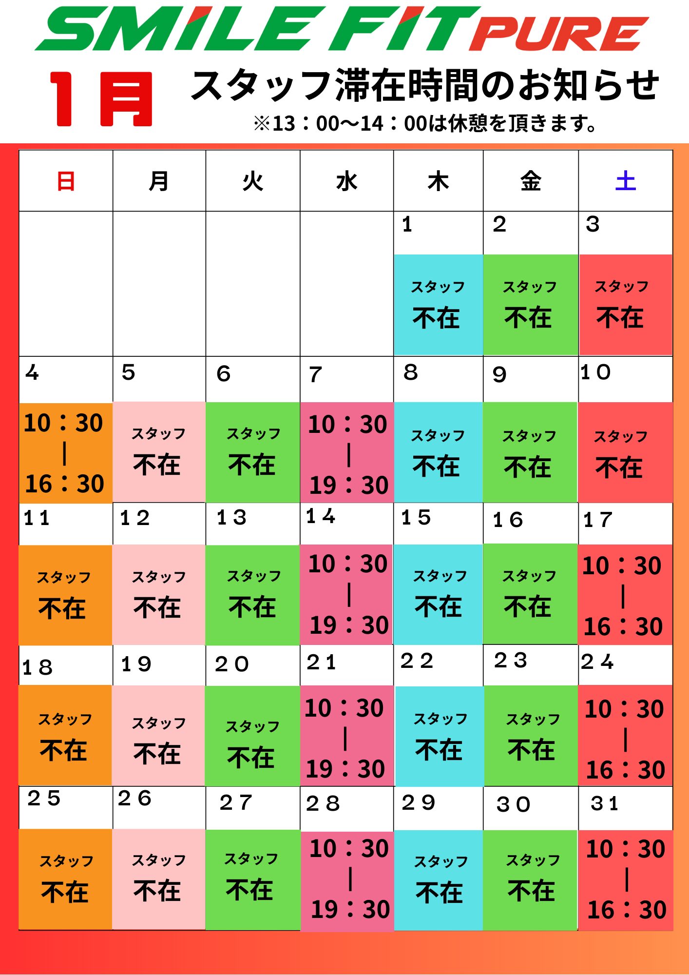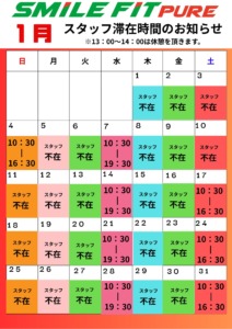 スマイルフィットピュアは基本的に無人での営業となっております。 ですが、入会していただいた皆様に、ご挨拶や施設の説明をさせてもらえたら思い、12月と1月はスタッフタイムを設定させていただきます‼